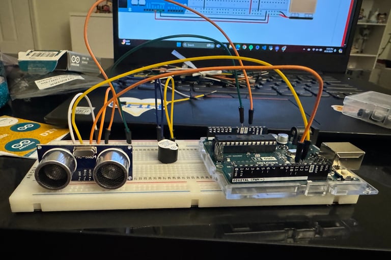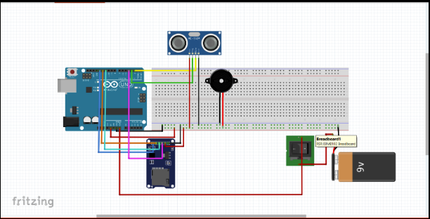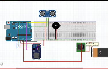 For this project, I started with performing trade studies on electronic devices. The Arduino Uno was a requirement for the class. The HC-SR04 Ultrasonic Sensor, Adafruit 5V buzzer, MicroSD card breakout board+, and QTEATAK On/Off/On Boat Toggle Rocker Switch were chosen for this project. I then created a fritzing diagram of the electronics before soldering each component to the protoboard.